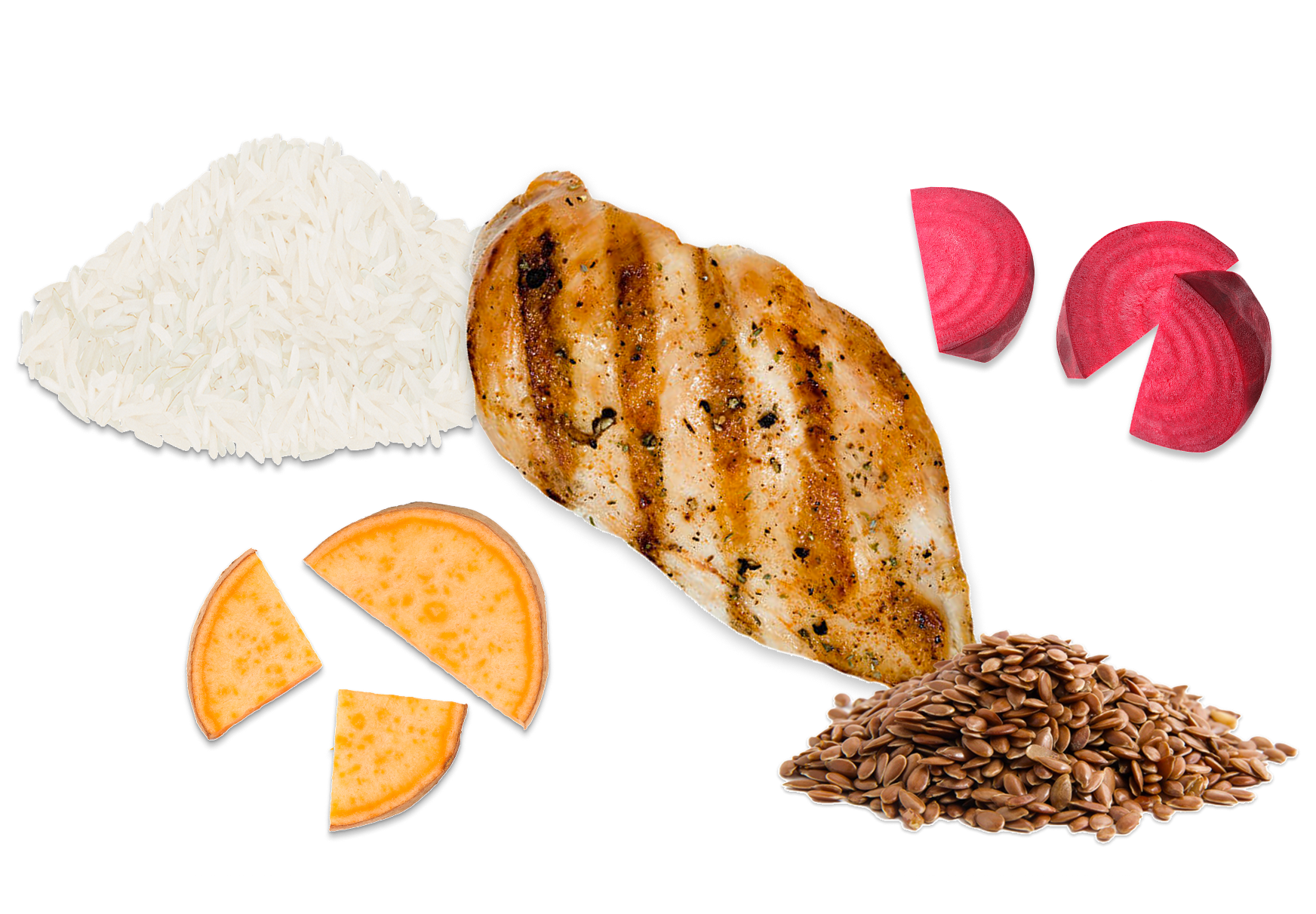 新鮮雞肉 (25%)、脫水雞肉 (25%)、白米、甜薯、水解雞肉蛋白 (6%)、雞油 (2%)、紅菜頭、雞肝水解物 (1.5%)、三文魚油 (1%)、亞麻籽、礦物質、菊苣根 (0.5%,天然低聚果糖和酵母果糖酵母(0.2%,天然甘露寡糖和β-葡聚醣來源)、胡蘿蔔、蔓越莓、藍莓、菠菜、香草(迷迭香、薑黃、丁香)